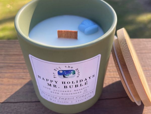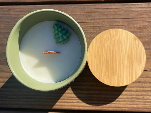 Includes: a wooden lid, wood wick, ceramic container